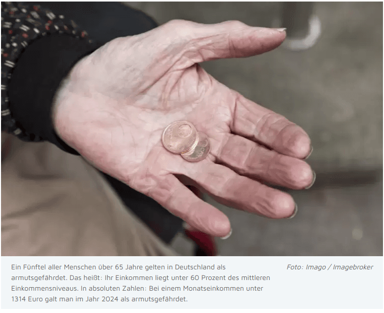 Die Zahlen malen da ein deutlicheres Bild – und dann tun sie es auch wieder nicht: Laut Statistischem Bundesamt galten im Jahr 2024 knapp 20 Prozent der Menschen über 65 Jahren als armutsgefährdet. Das Risiko, in Altersarmut zu geraten, erhöht sich dabei mit dem Lebensalter: „Insgesamt 22,4 Prozent der Bevölkerung im Alter von 80 Jahren und älter sind von Einkommensarmut betroffen“, so eine Studie des Bundesfamilienministeriums von 2021.