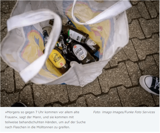 Wahrscheinlich gibt es auch bei Armut so etwas wie eine Taktung. Beobachtet jedenfalls der freundliche Mann in den mittleren Jahren, der zu ganz verschiedenen Zeiten auf seiner Lieblingsparkbank im Ludwigshafener Stadtteil Mundenheim sitzt. Schichtarbeiter, da nimmt man den Tag in wechselnden Ausschnitten zur Kenntnis. „Morgens so gegen 7 Uhr kommen vor allem alte Frauen“, sagt der Mann, und sie kommen mit teilweise behandschuhten Händen, um auf der Suche nach Flaschen in die Mülltonnen zu greifen. Morgens um 7 Uhr, da ist eben noch wenig los, und das Tun ist den Blicken der anderen entzogen. Später am Tag kommen diejenigen, denen man ihre Obdachlosigkeit ohnehin ansieht, vor wem will man sich da noch schämen, und warum überhaupt. Und dazwischen mischen sich welche, „sehr gut angezogen, die müssten wohl gar keine Flaschen sammeln, ist’n Hobby, vermute ich“, meint der freundliche Mann und muss grinsen.