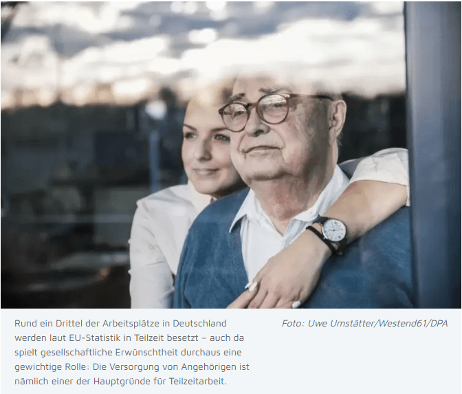 Zudem: Rund ein Drittel der Arbeitsplätze in Deutschland werden laut EU-Statistik in Teilzeit besetzt – auch da spielt gesellschaftliche Erwünschtheit durchaus eine gewichtige Rolle: Die Versorgung von Angehörigen ist nämlich einer der Hauptgründe für Teilzeitarbeit. Für 24 Prozent der in Teilzeit Beschäftigten ist die Betreuung von Kindern oder pflegebedürftigen Angehörigen der Hauptgrund, nicht Vollzeit zu arbeiten, so das Statistische Bundesamt.
