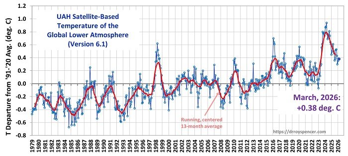 Die globale Temperatur ist im März 2026 gegenüber Februar etwa gleichgeblieben. Die Abweichung der globalen Mitteltemperatur vom langjährigen Mittel der Satellitenmessungen liegt nun bei +0,38 Grad Celsius über dem Mittelwert der vergangenen 30 Jahre. Im Vormonat betrug die Abweichung +0,39 °C.